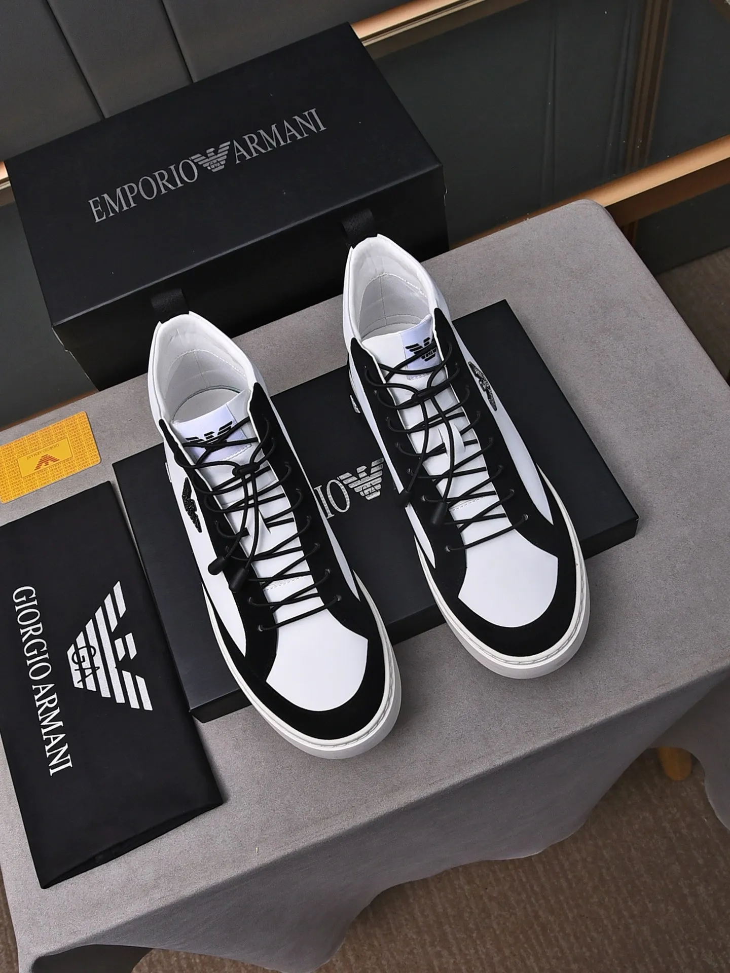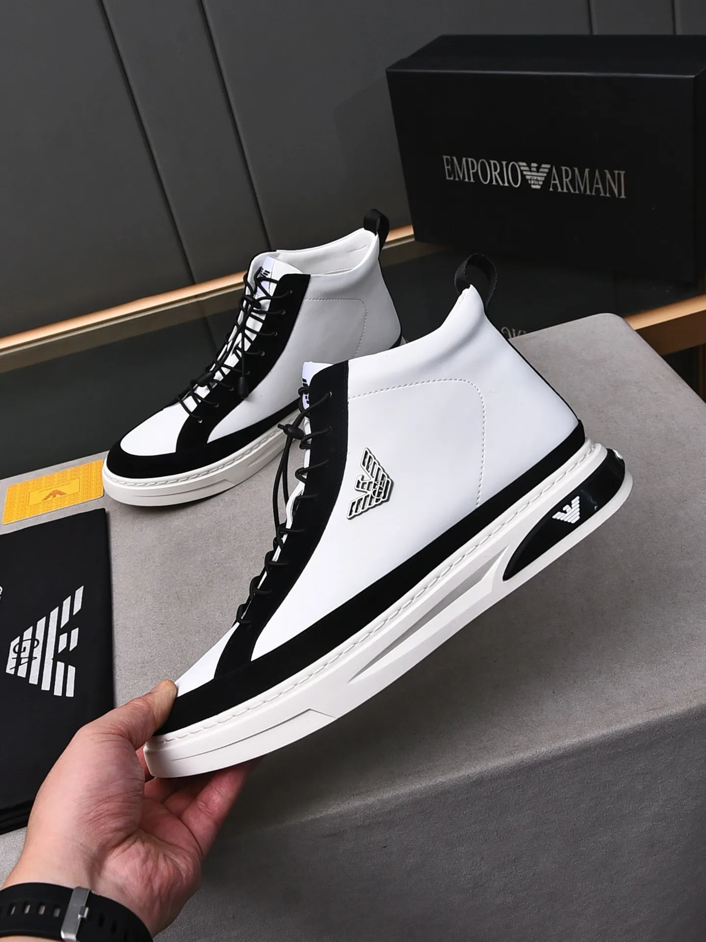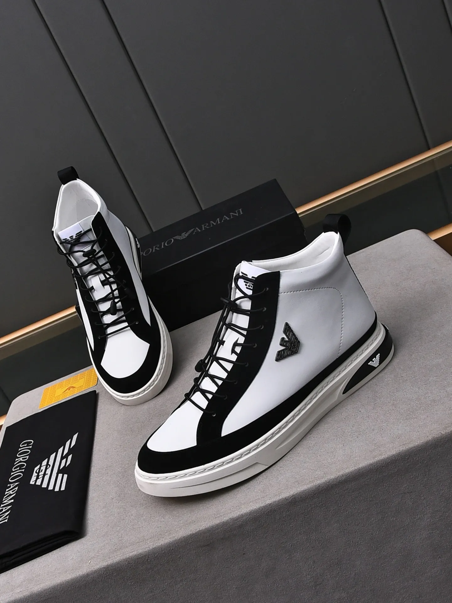 Replica Armani High Tops Shoes For Men #1408398 Wholeale Only $82.00 USD outlet! Gender MenSize US 4=EUR(38), US 5=EUR(39), US 6=EUR(40), US 7=EUR(41), US 8=EUR(42), US 9=EUR(43), US 10=EUR(44), Wholesale Replica Armani High Tops Shoes latest arrivals enjoy free shipping and save up 70% OFF with best quality! Cheap Armani High Tops Shoes For Men #1408398 Replica Wholesale [$82.00 USD] [ITEM#1408398] on Replica Armani High Tops Shoes